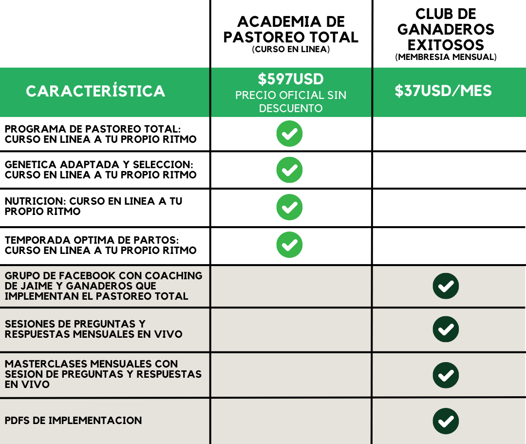 Mi curso (Programa de Pastoreo Total) y mi membresía mensual (Club de Ganaderos Exitosos) tienen diferentes propósitos en diferentes puntos de tu camino, ¡así que los mantengo separados para ahorrarte dinero!